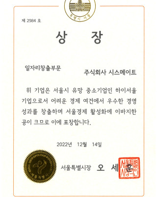 제 2984 호 (일자리창출부문 서울시장 표창)