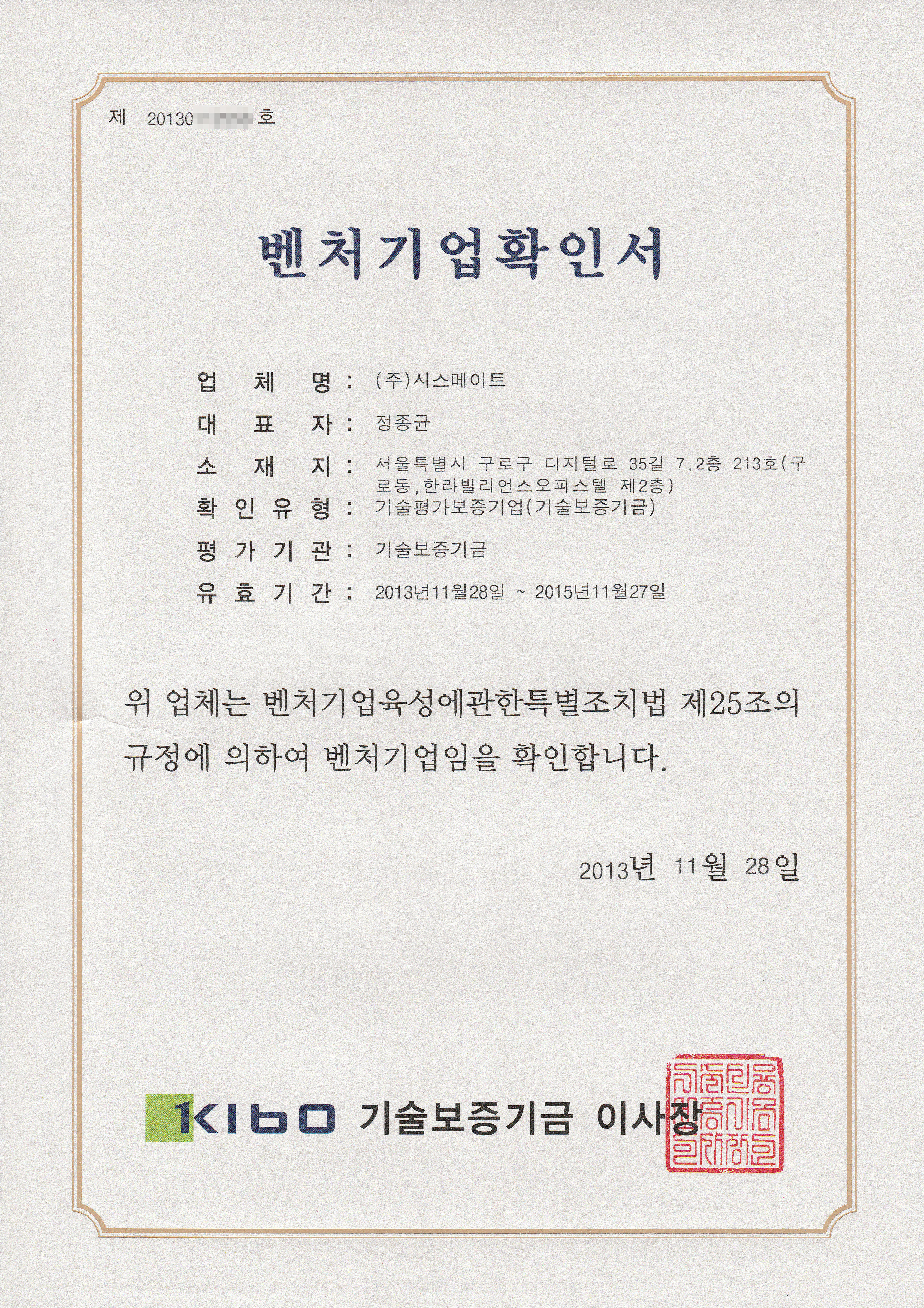 안녕하세요. 디지털 사이니지 전문기업, 시스메이트입니다. 시스메이트가 벤처기업 인증을 획득하였음을 안내 드립니다. 앞으로 더 나은 서비스로 보답 하겠습니다. 감사합니다. 2013년 11월 28일 주식회사 시스메이트 드림