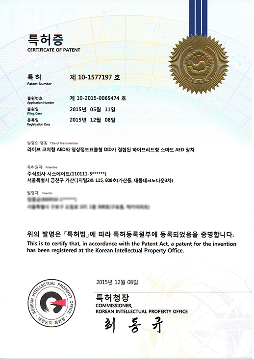 시스메이트에서 특허 신청한 하이브리드형 스마트 AED DID 장치 특허가 등록되어 안내드립니다.
