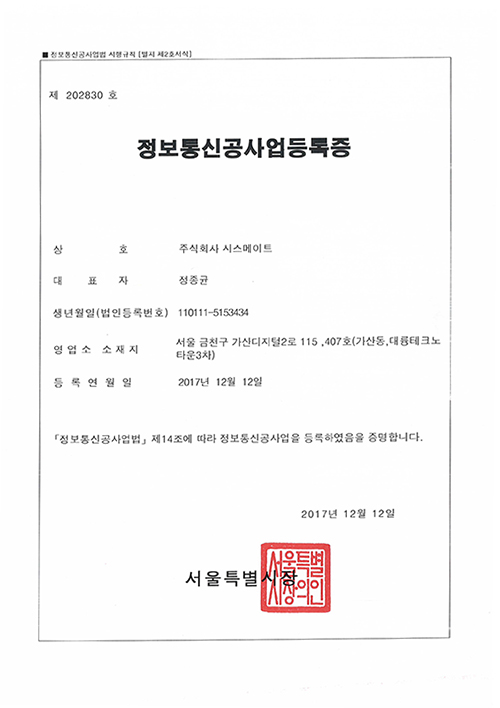 당사는 2017년 12월 12일부로 정보통신공사업 면허를 취득하였음을 알려드립니다.