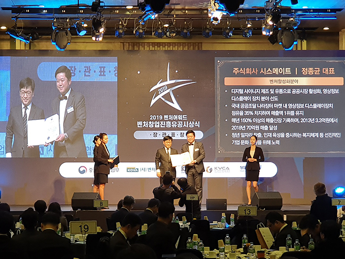 시스메이트가 12월 10일 서울 엘타워에서 열린 "2019 벤처어워드 벤처창업 진흥 유공"시상식에서
