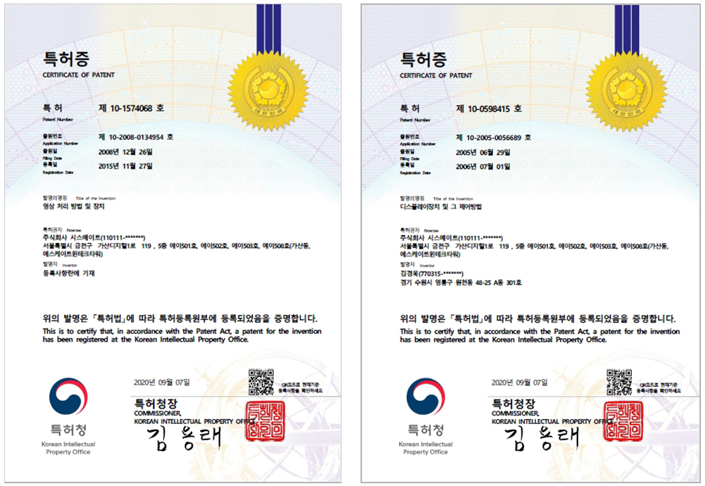 시스메이트는 이번 이전받은 2종의 기술 특허를 기존 고화질