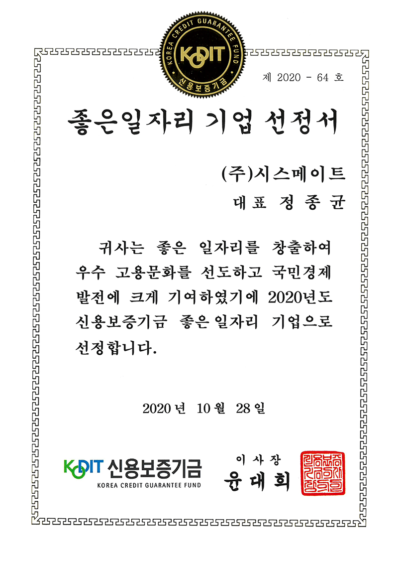 ㈜시스메이트는 25만개 기업 중 2020년도 좋은 일자리 100개사 기업에 선정되었습니다.