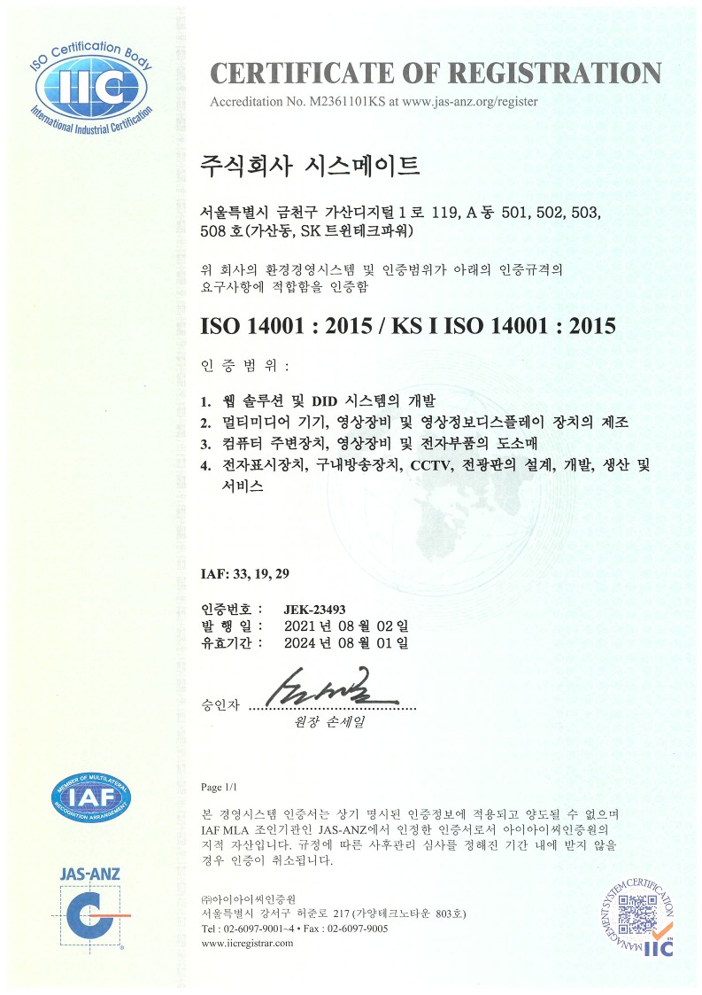 시스메이트가 환경경영 체제에 관한 국제 표준인 ‘ISO14001(환경경영시스템) 인증을 획득하였습니다.