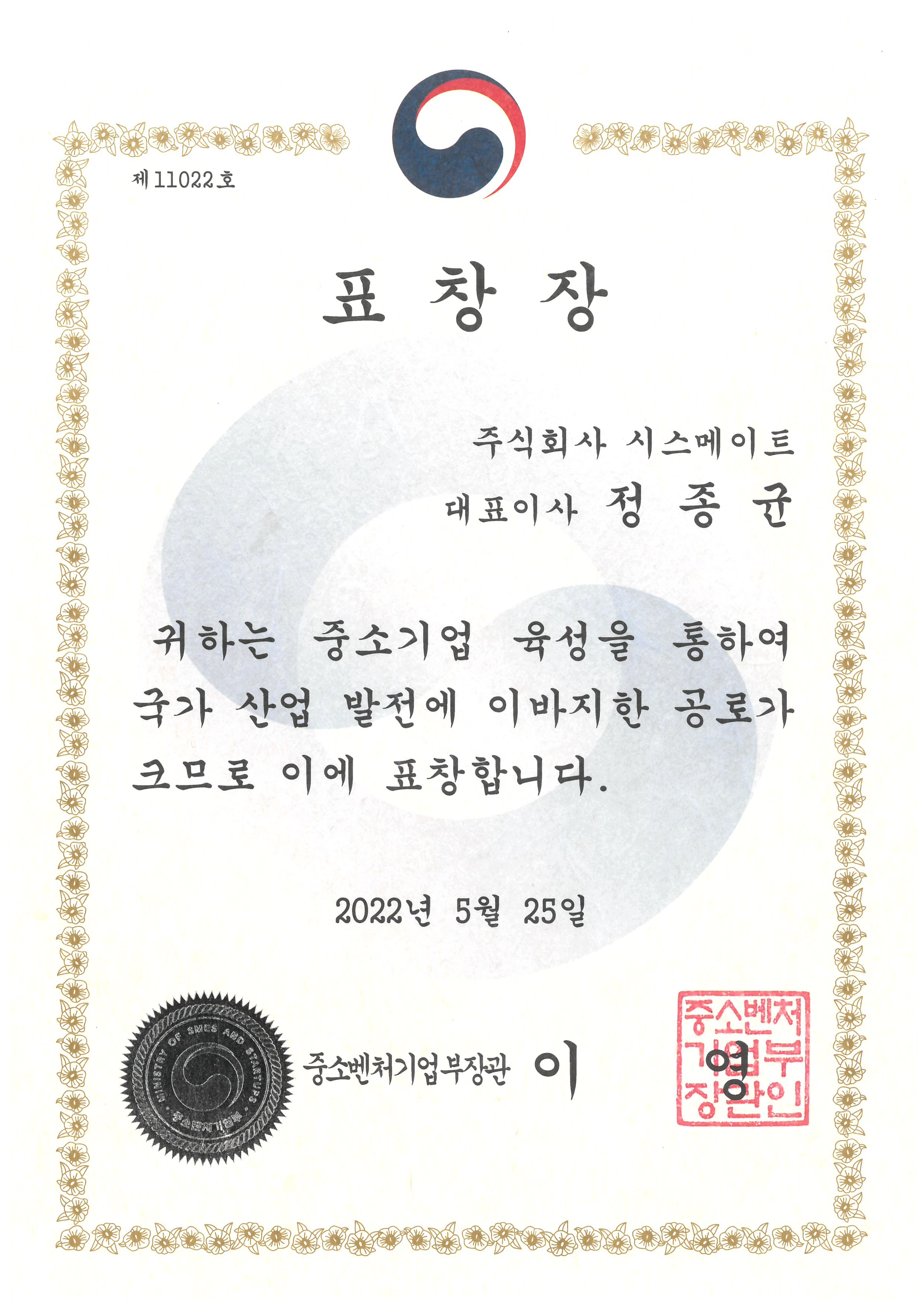 ‘2022 서울 중소기업인 대회’에서 중소기업 유공자 포상 중소벤처기업부 장관 표창을 수상하였습니다.