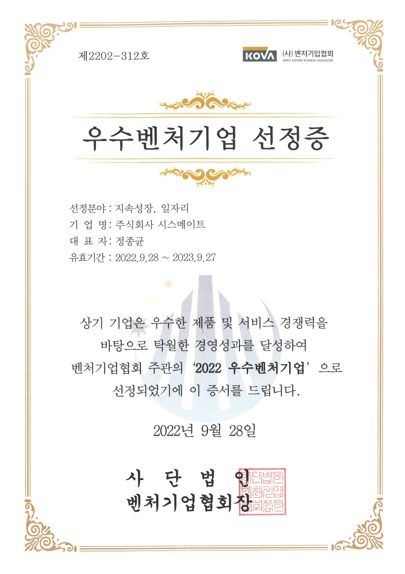 시스메이트가 벤처기업협회가 주관한 ‘2022년 우수벤처기업’에서