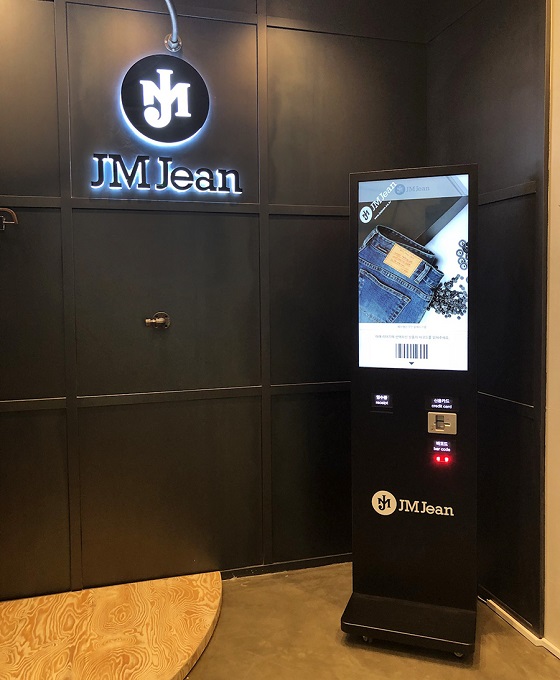 시스메이트가 최근 셀프 청바지숍 제이엠진에 공급한 무인 결제 키오스크의 모습