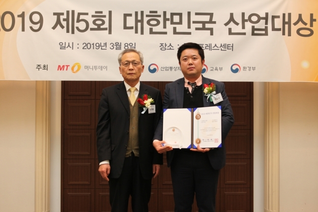 정종균 시스메이트 대표(사진 오른쪽)가 '기술혁신대상'을 수상하고 도영봉 머니투데이 부사장과