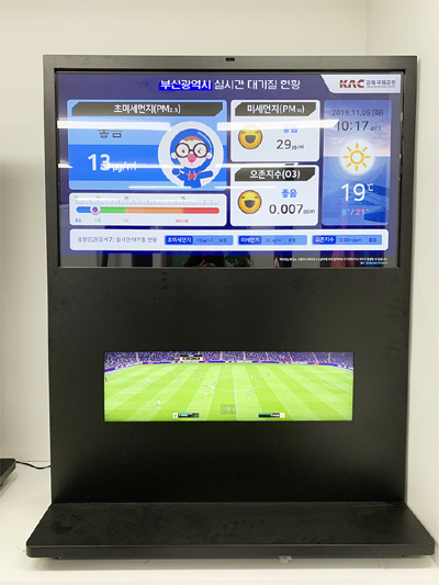 디지털 사이니지에는 미세먼지 감지 센서 내장형 제품을 신규 론칭하여 방문객들이 실시간으로