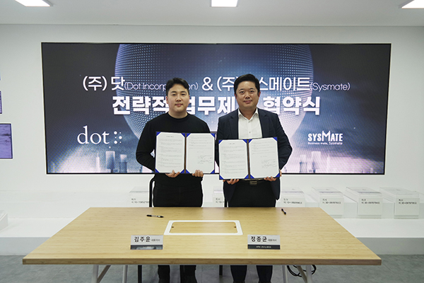 시스메이트 서울 본사에서 진행된 업무 제휴 협약식에는 시스메이트 정종균 대표와 닷 김주윤 대표 및 관련 임직원들이 참석한 가운데,