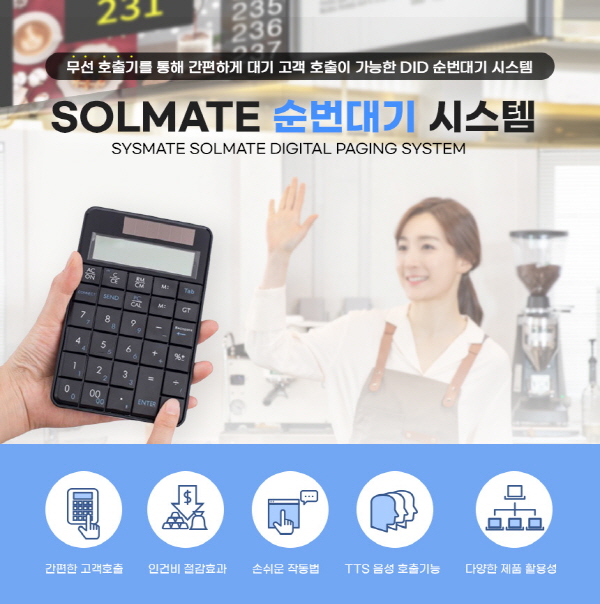 ‘스마트 순번대기 솔메이트(SOLMATE)’는 시스메이트에서 개발∙생산하는 200여 종 이상의 디지털 사이니지 기기와 호환이 가능하여