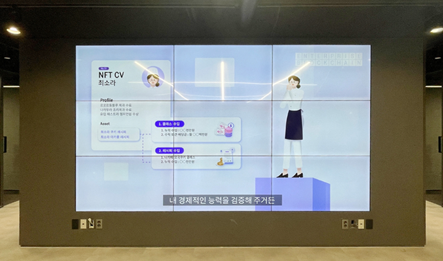 진도군청 내부 벽면에 설치된 3단 3열 비디오월은  1.8mm 슬림 베젤로 뛰어난 화면 몰입감을 선사하며
