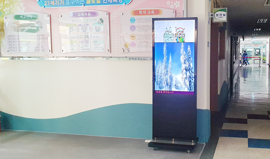 각종 교내 안내, 공지 사항 및 학교 홍보용 콘텐츠를 표출하는 디지털 게시판으로 활용됩니다.