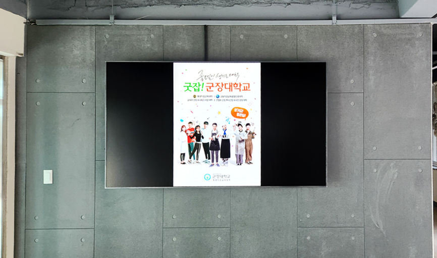 55인치 고화질 화면으로 송출되는 시스메이트 스탠드 사이니지는