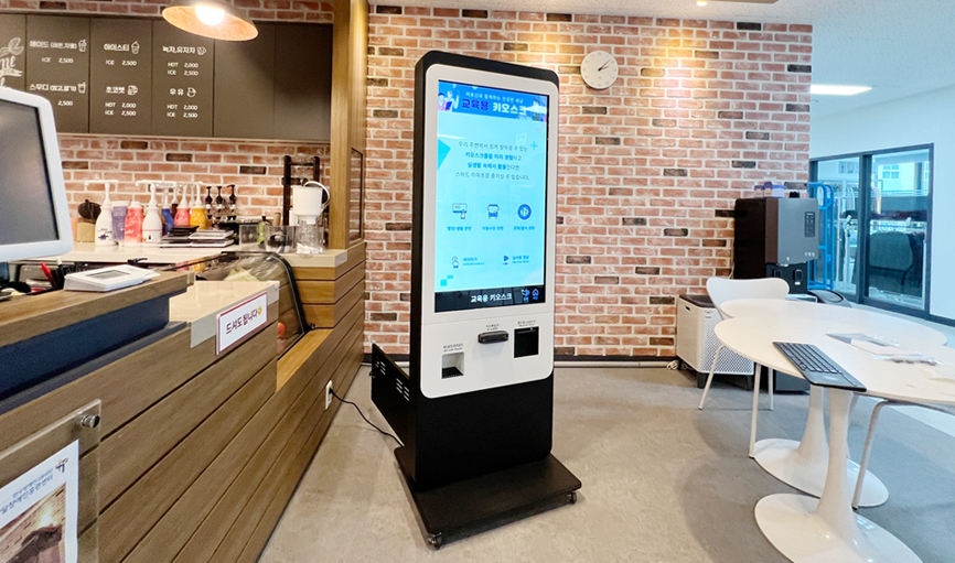 시스메이트의 자체 공장에서 제조한 함체와 삼성 43인치 사이니지가 결합된 스탠드 DID로