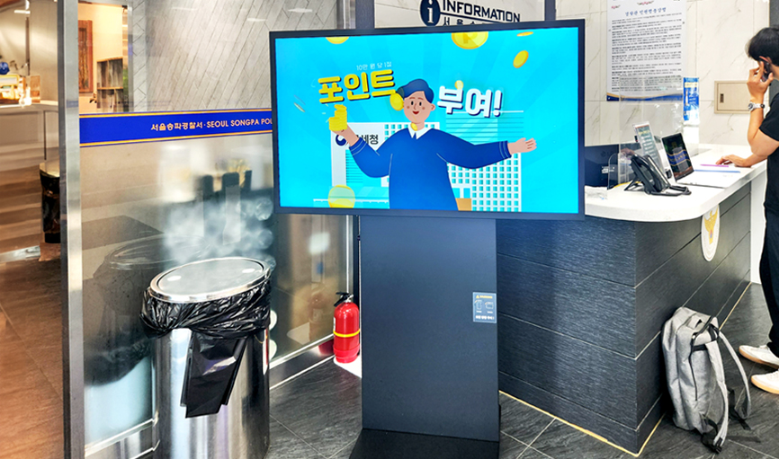 시스메이트의 자체 공장에서 제조한 함체와 삼성 55인치 사이니지가 결합된 스탠드 DID로